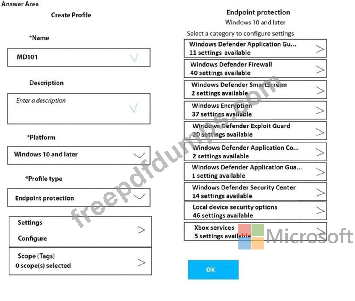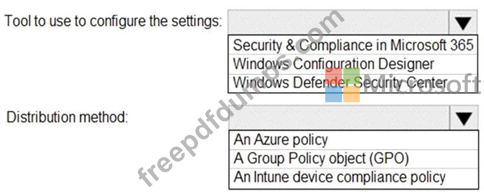 Which two settings should you configure in Endpoint protection? To answer, select the appropriate settings in the answer area.