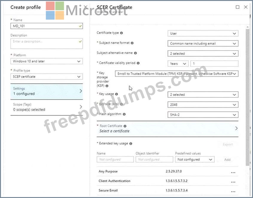 You are configuring a device profile as shown in the exhibit. (Click the tab.) You need to complete the SCEP profile.