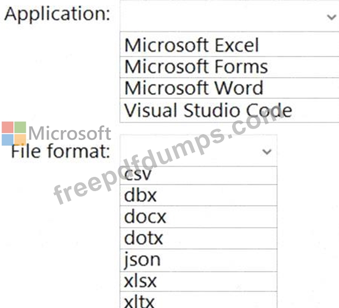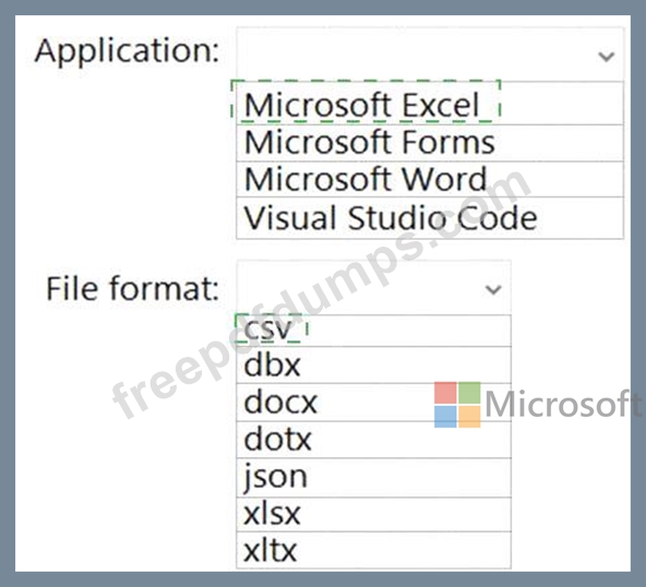 Which application should you use to create the template, and in which file format should the template be saved? To answer, select the appropriate options in the answer area.
