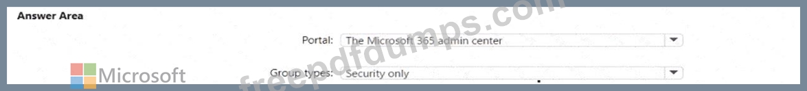 Which portal should you use, and to which types of groups will the policy apply? To answer, select the appropriate options in the answer area.