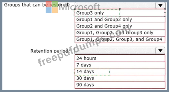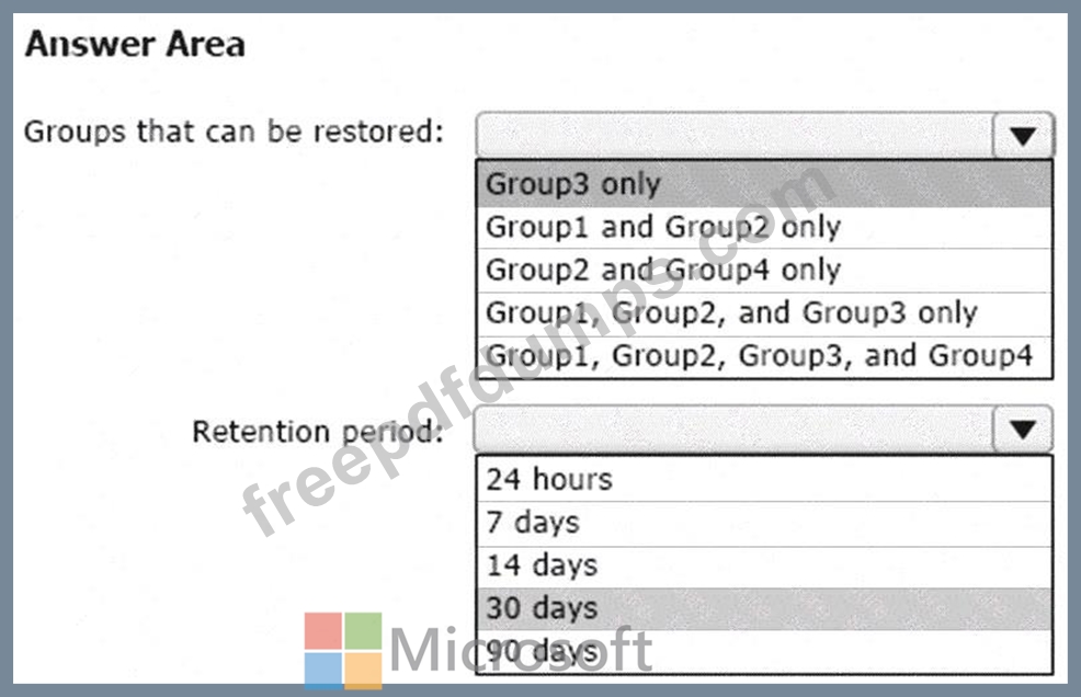 Which groups can be restored, and what is the retention period? To answer, select the appropriate options in the answer area.