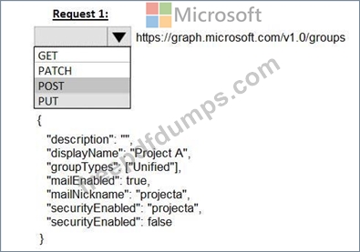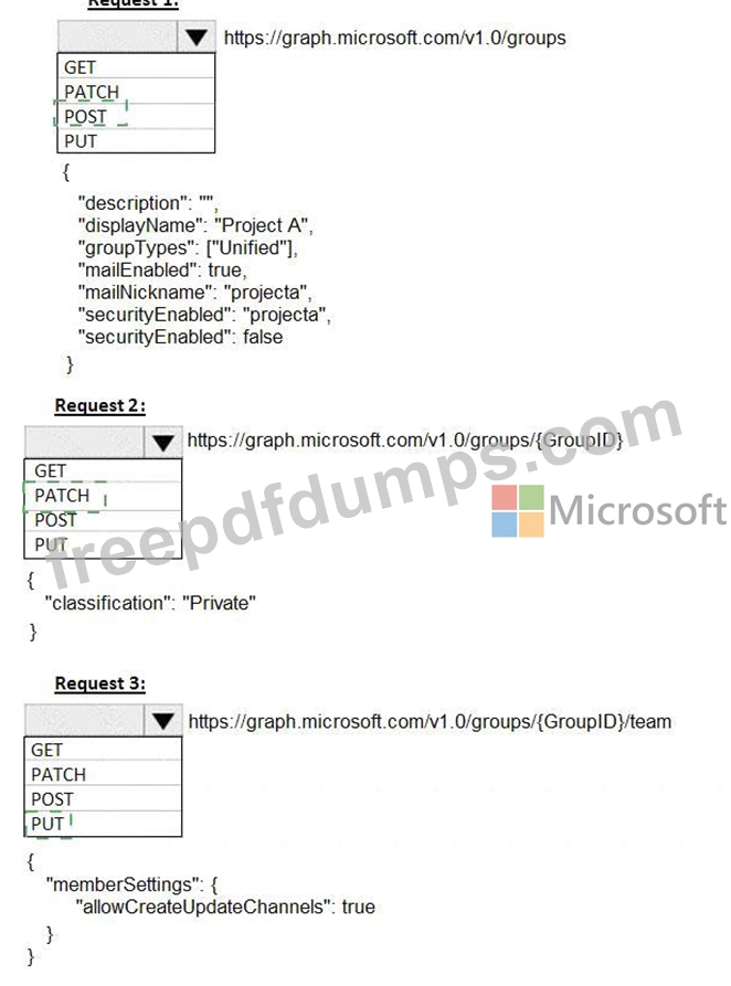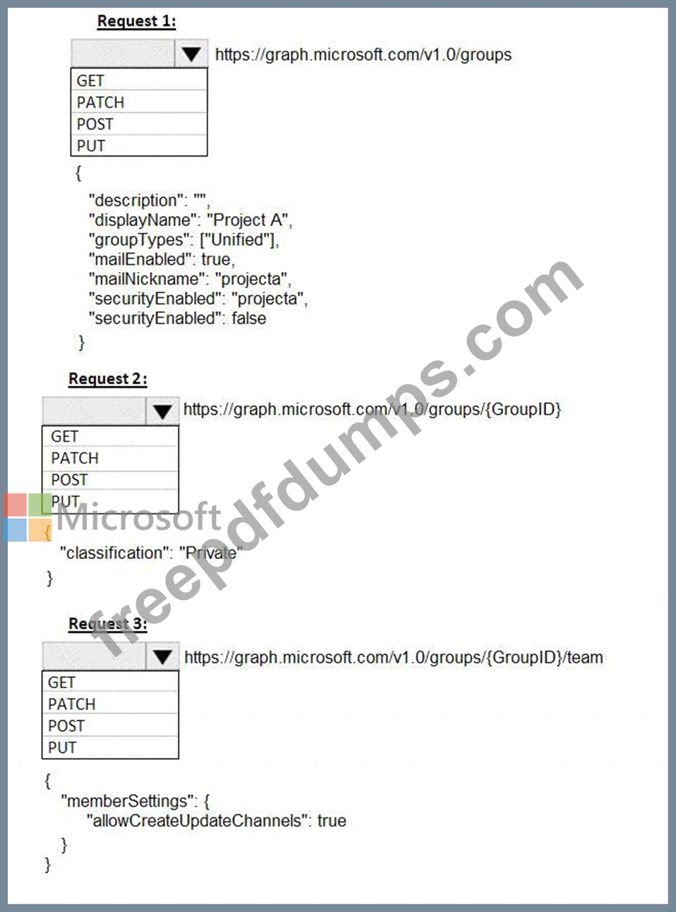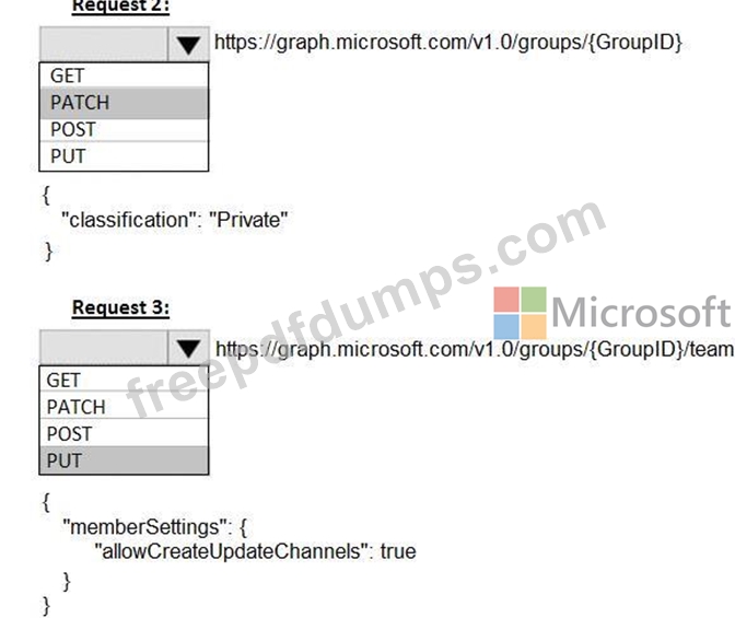 How should you complete the REST requests? To answer, select the appropriate options in the answer area.