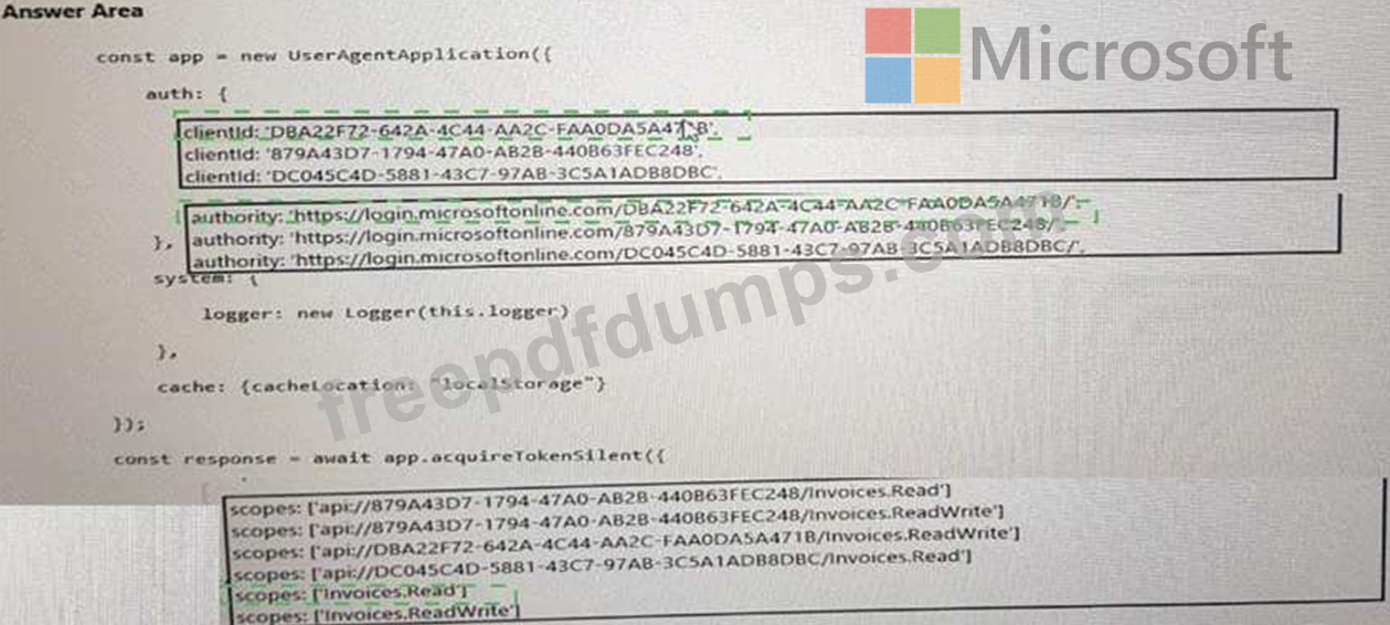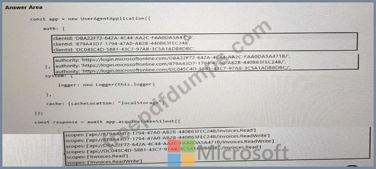 Which code should you use in Contoso.Spa to obtain an access token for Contoso.Invoicing? To answer, select the appropriate options in the answer area.