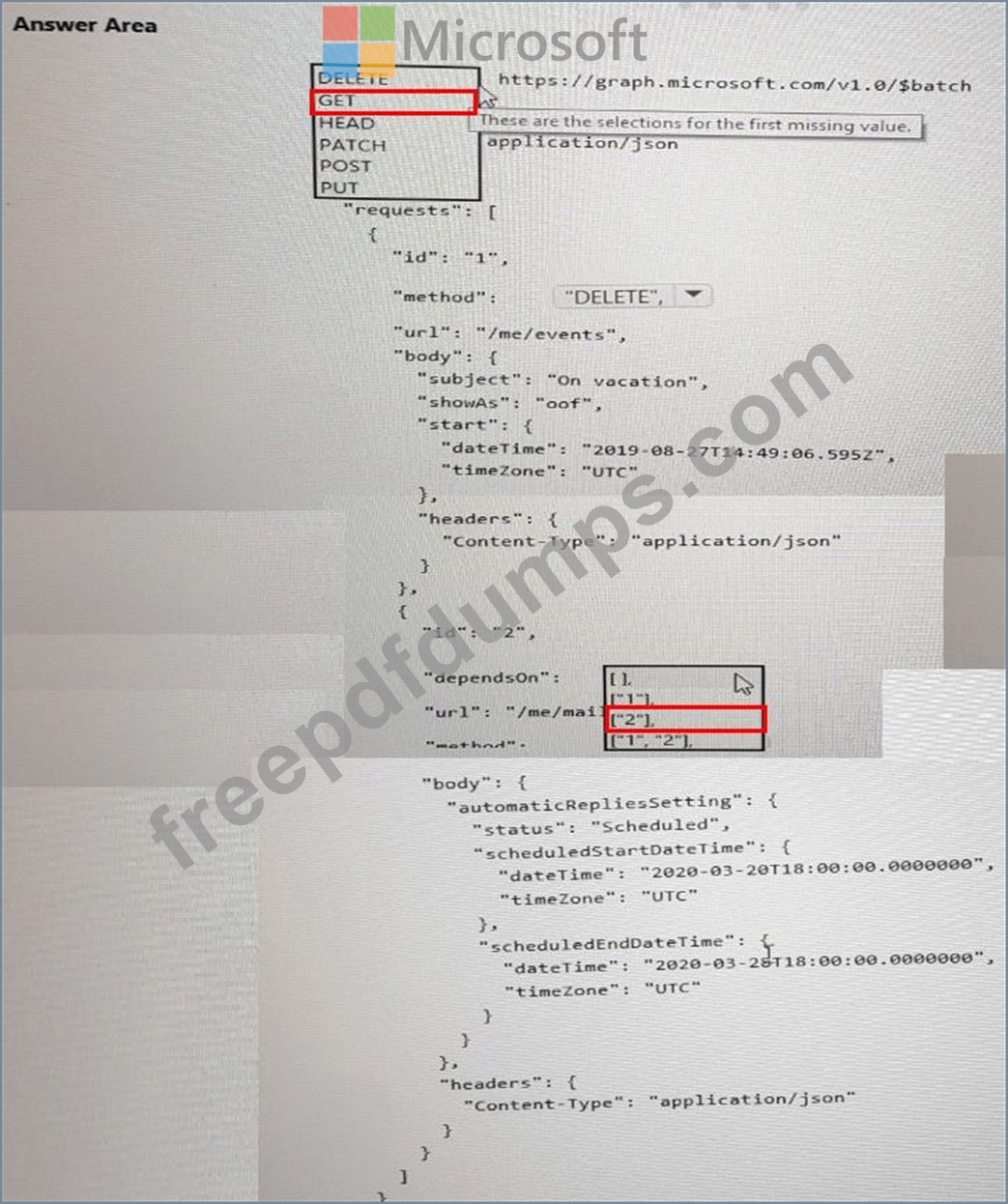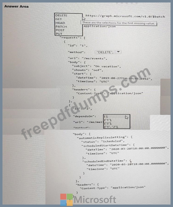 How should you complete the batch request? To answer, select the appropriate options in the answer area.