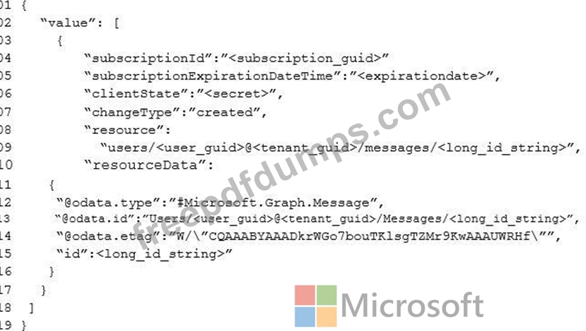 You have the following JSON message that will be sent by the Microsoft Graph service to detect the vendor emails.