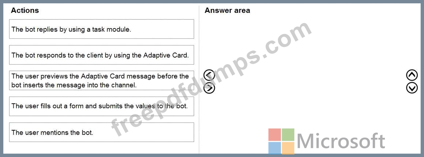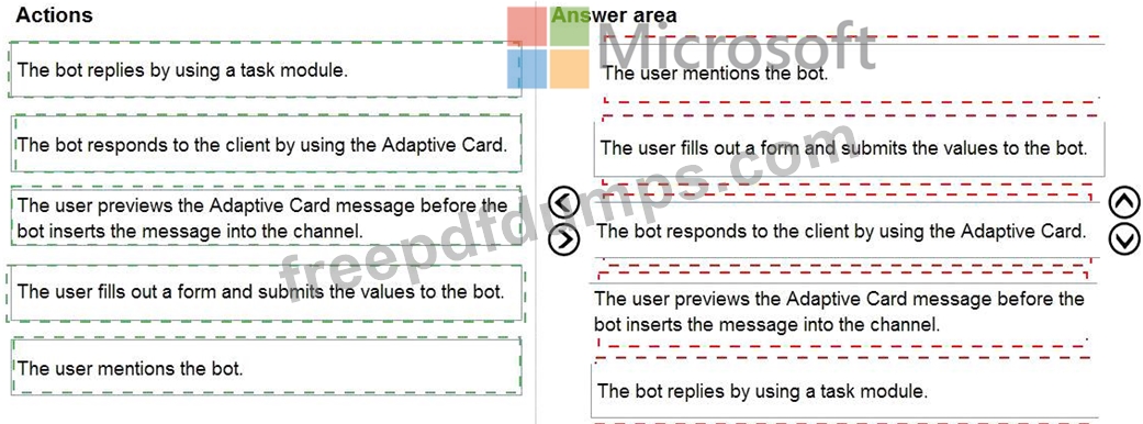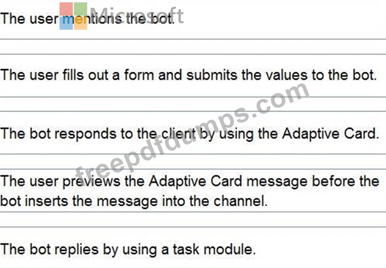 In which order will a user and the bot interact? To answer, move all actions from the list of actions to the answer area and arrange them in the correct order.