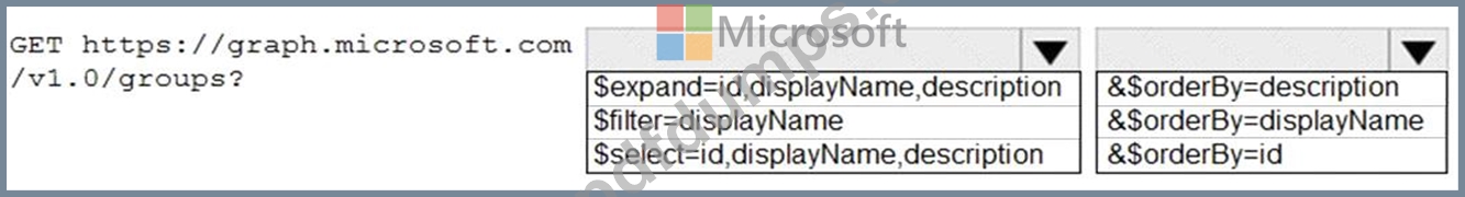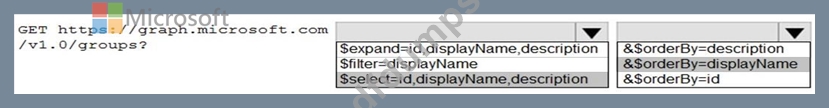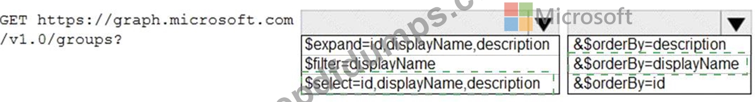 How should you complete the Graph API call? To answer, select the appropriate options in the answer area.