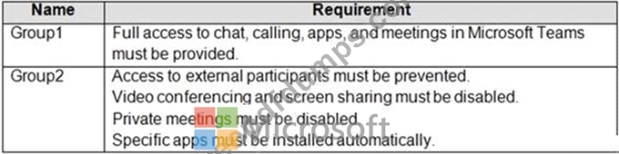 You have a Microsoft 365 subscription that uses Microsoft Teams. The subscription contains 1,000 users in the groups shown in the following table.