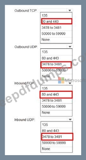 Which inbound and outbound ports should you recommend? To answer, select the appropriate options in the answer area.