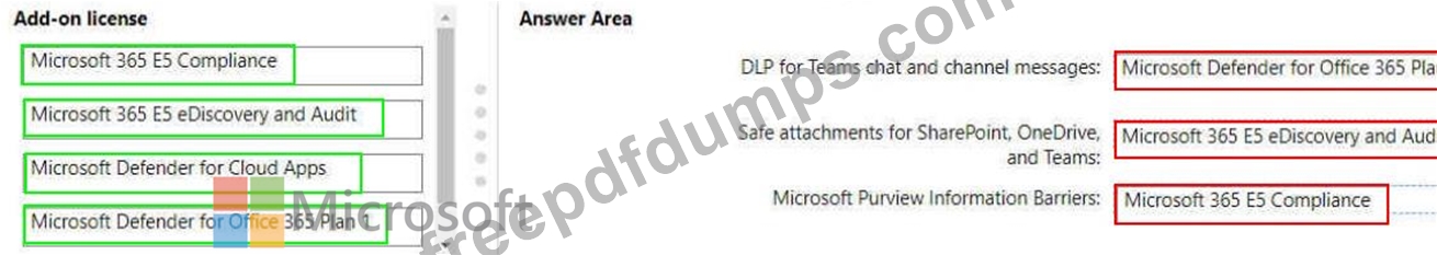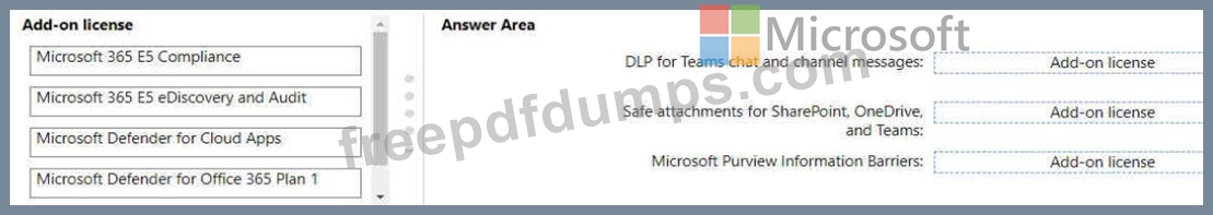 You need to purchase add-on licenses that will enable the following features for the Teams environment Microsoft Purview Information Barriers Data loss prevention (DIP) for Teams chat and channel messages Safe attachments for Microsoft SharePoint OneDrive and Teams To answer, drag the appropriate reports to the correct requirements. Each report may be used once, more than once, or not at all.