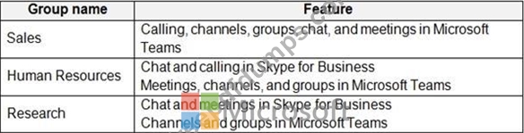 You plan to upgrade to Microsoft Teams in stages based on groups. The features required by each group are shown in the following table.