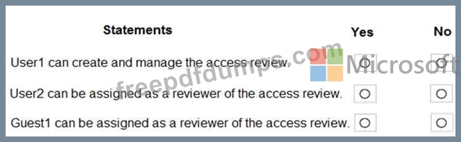A new access review needs to be created for Project1. For each of the following statements, select Yes if the statement is true. Otherwise, select No.