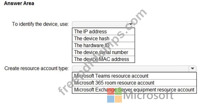 Which type of resource account should you create, and what should you use to identify the device? To answer, select the appropriate options in the answer area.
