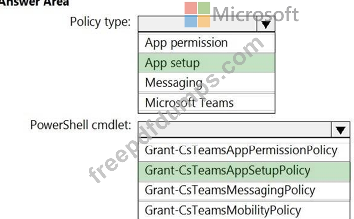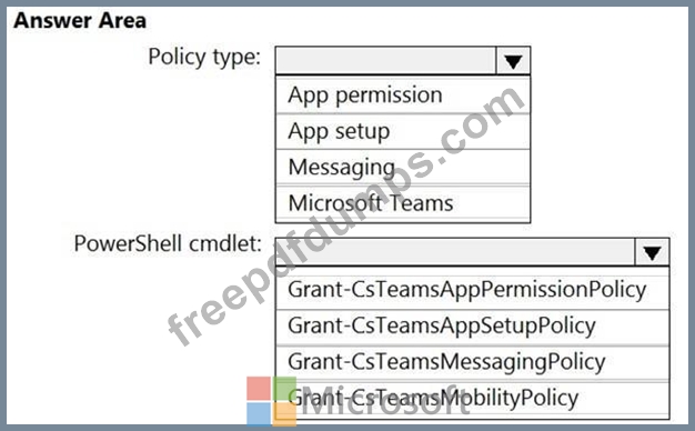 Which policy type should you create and which PowerShell cmdlet should you run to assign the policy? To answer, select the appropriate options in the answer area.