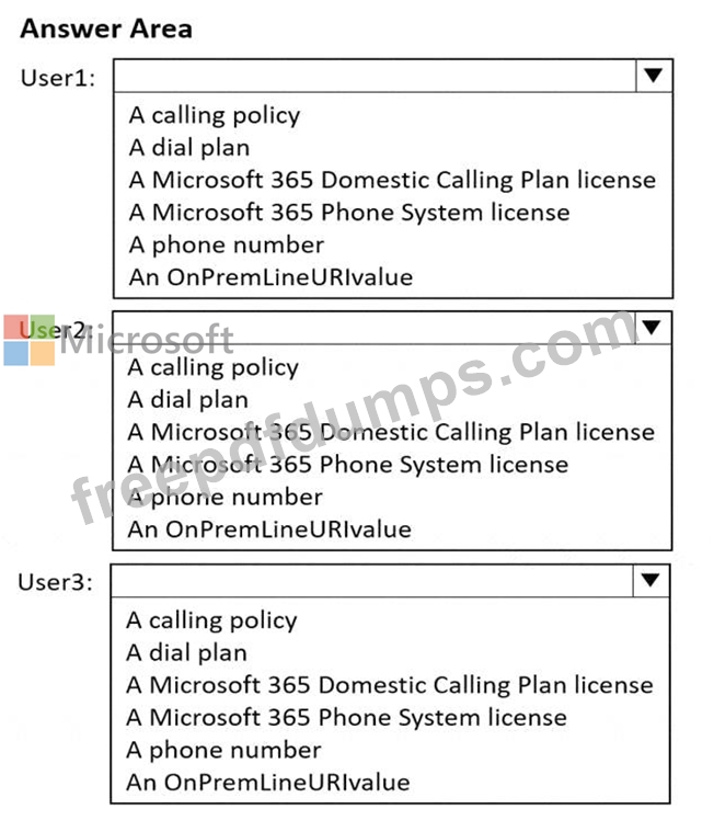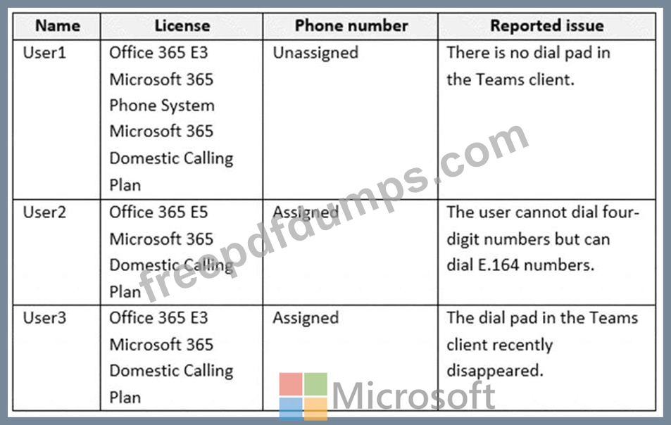 You are deploying Microsoft Teams Calling Plans to three users as shown in the following table.