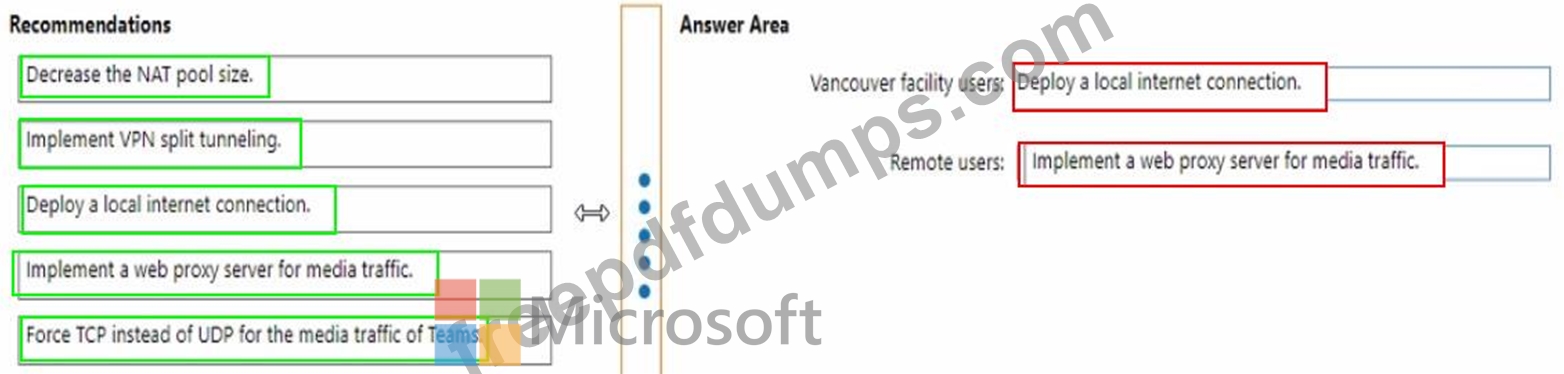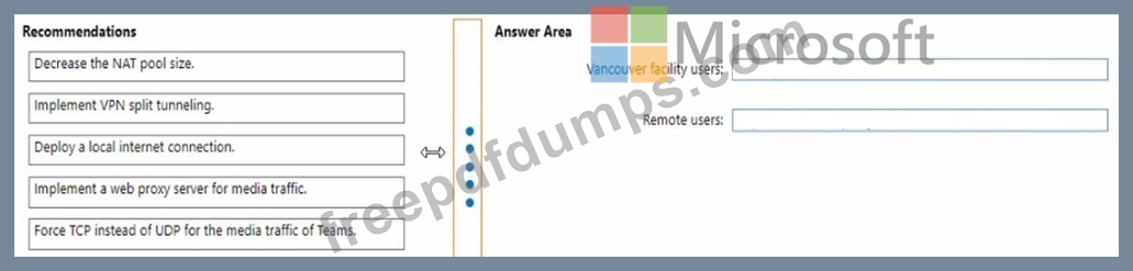 What should you recommend for the Vancouver facility users and the remote sale team users? To answer, drag the appropriate recommendation to the correct users. Each recommendation may be used once, more than once, or not at all. Vou may need to drag the split bar between panes or scroll to view content NOTE: Each correct selection is worth one point.