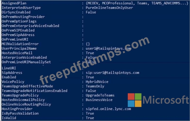 You run the Get-CsOnlineUser cmdlet and receive the output shown in the exhibit (Click the Exhibit tab.) Which three actions should you perform to ensure that the dial pad appears in the Teams client? Each correct answer presents part of the solution.