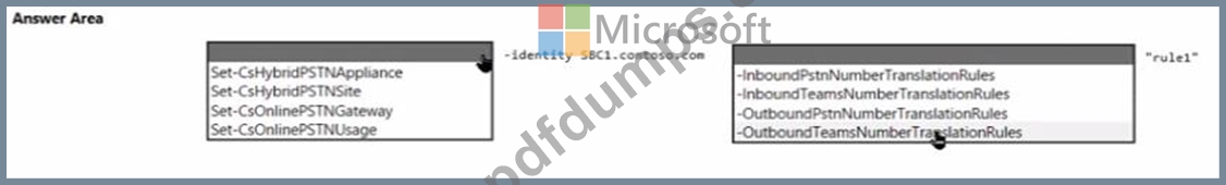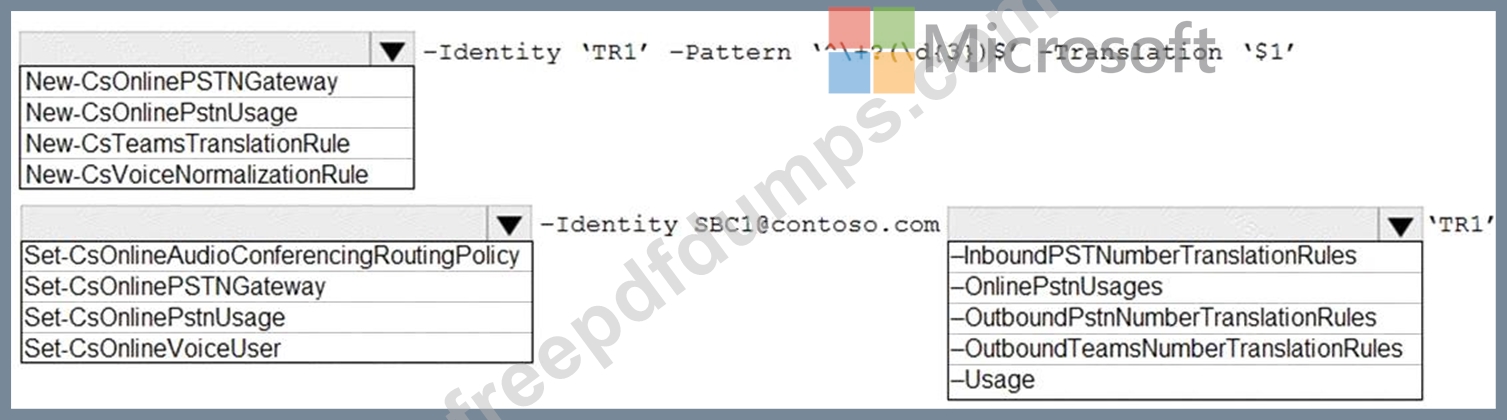 You have a Microsoft Teams Phone employment mat contains a Session Border Controller (SBC named SBCi.contoso.com. Direct Routing integrates with a P6X phone system that uses only four-digit dialing and is configured to use the SBC. Teams is configured to use dial plans that normalize any four-digit calls to E-164. You have the following translation rule.