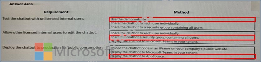 You need to ensure that appropriate users can access the chatbot. Which methods should you use? To answer, select the appropriate options in the answer area. NOTE: Each correct selection is worth one point.
