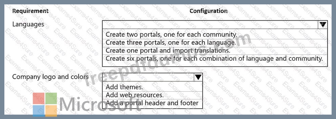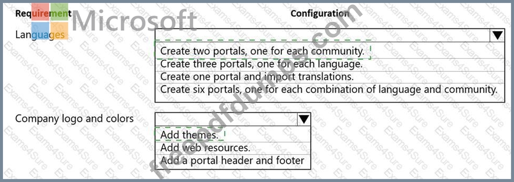 You have a Power Apps portal app that supports a sales community and a service community in the same environment. The only language configured in the environment is English. The company wants to add support for two more languages.