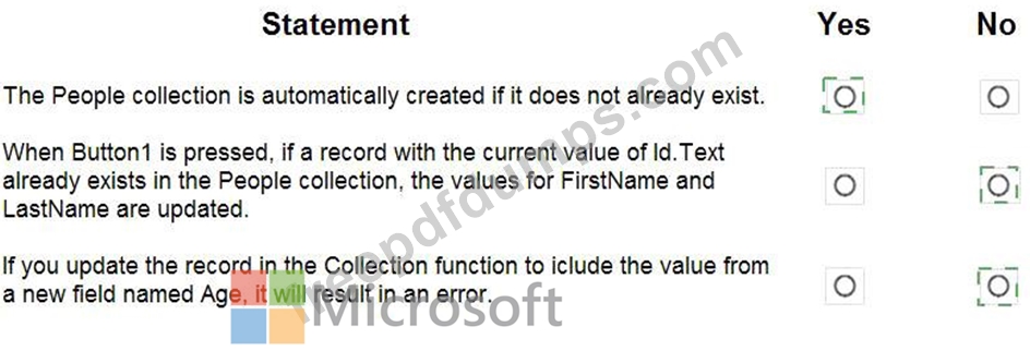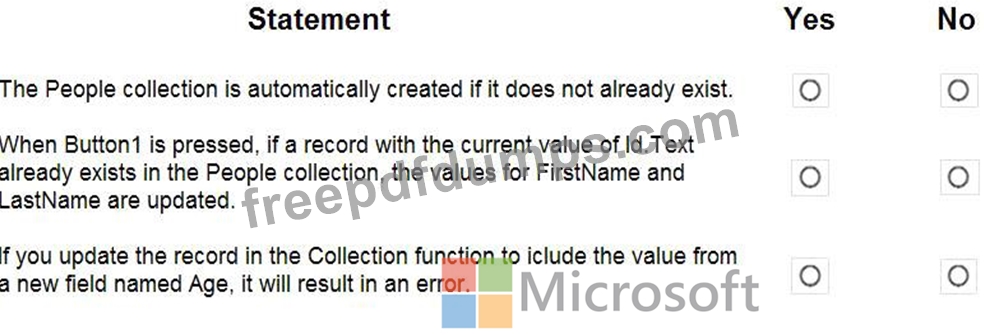 Collect(People, {Id:Id.Text, FirstName:FirstName.Text, LastName:LastName.Text}) For each of the following statements, select Yes if the statement is true. Otherwise, select No.