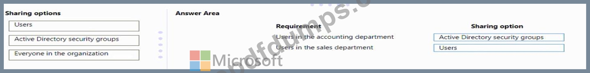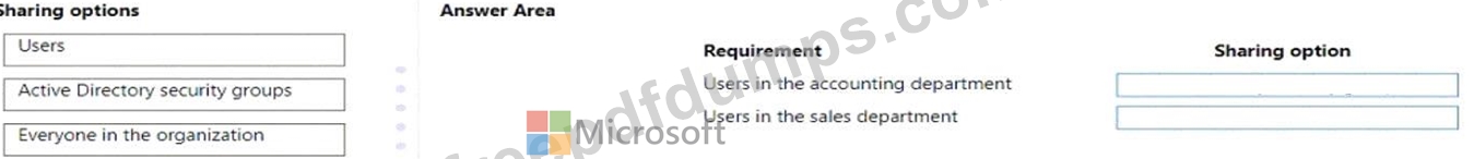 Which sharing options should you use? To answer, drag the appropriate sharing options to the correct requirements. Each sharing option may be used once, more than once, or not at all. You may need to drag the split bar between panes or scroll to view content.