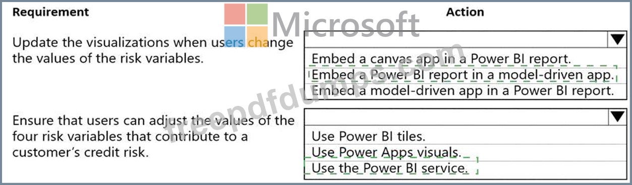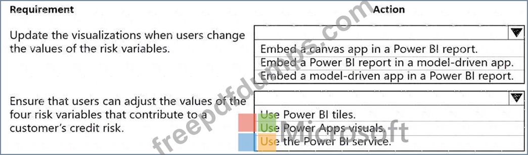 A bank uses Power BI visualizations to help determine whether they should loan money to a customer. The bank has three different visuals that are part of a Power BI report. The bank uses a set of four risk variables that indicate whether the customer is creditworthy.