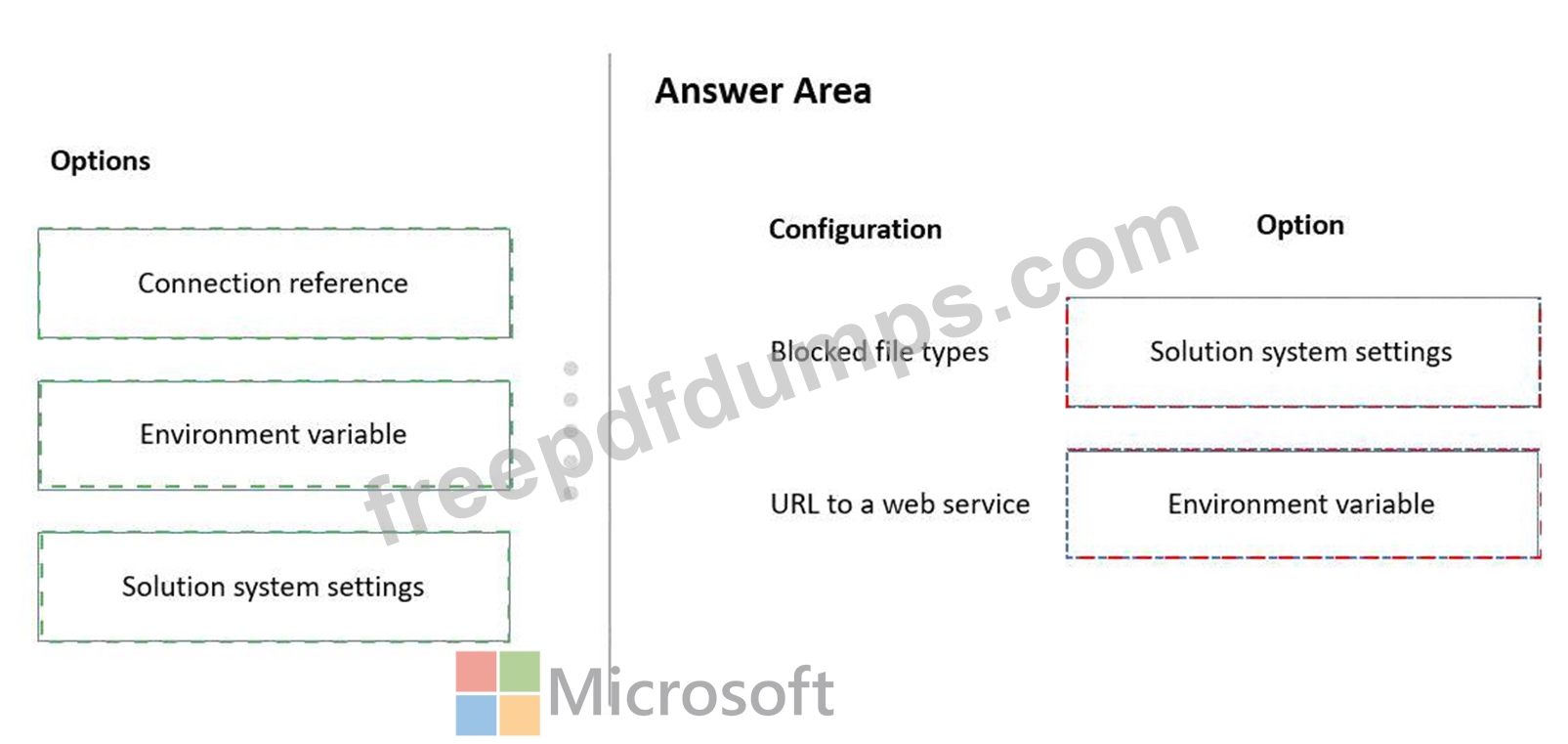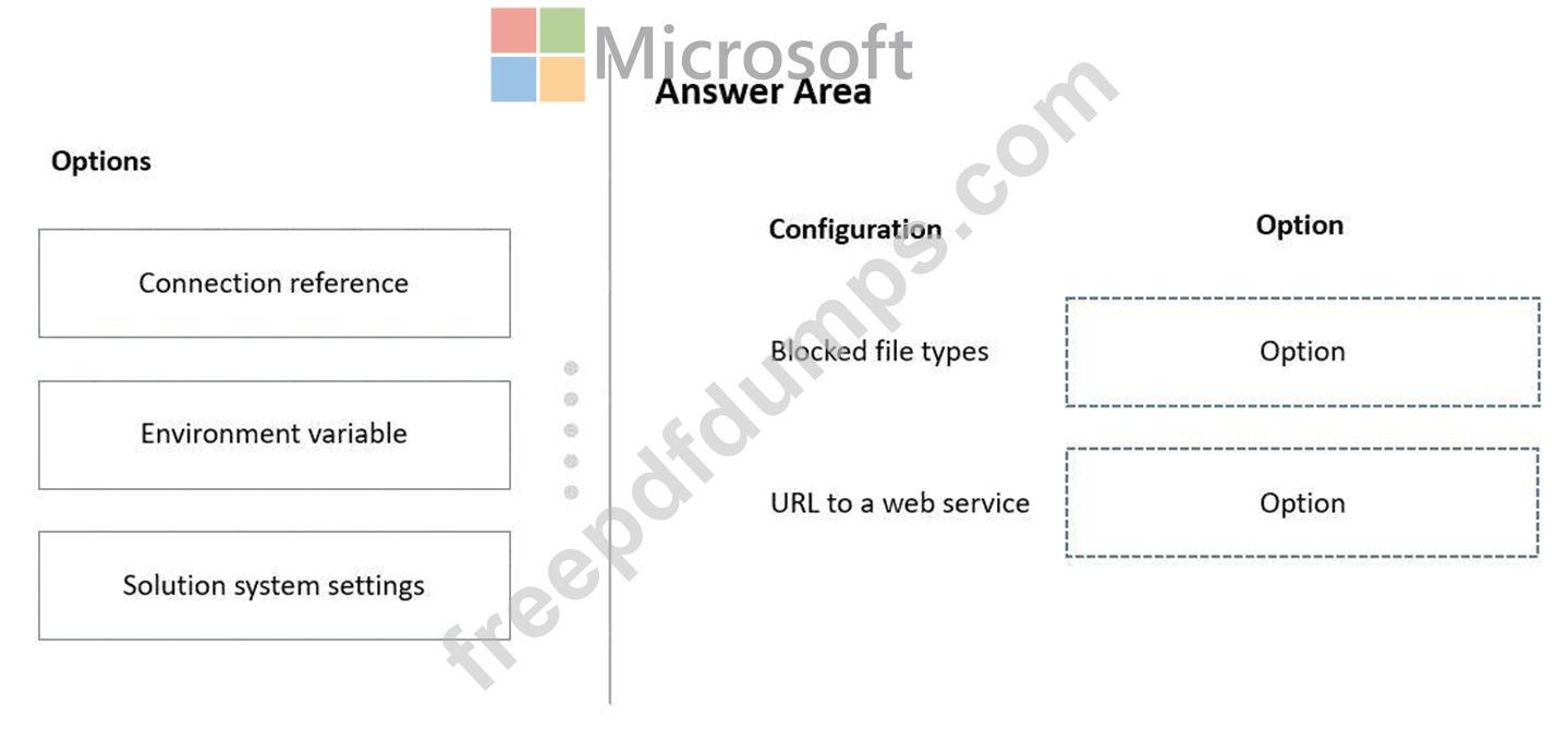Which option should you use? To answer, drag the appropriate options to the correct configurations. Each option may be used once, more than once, or not at all. You may need to drag the split bar between panes or scroll to view content.