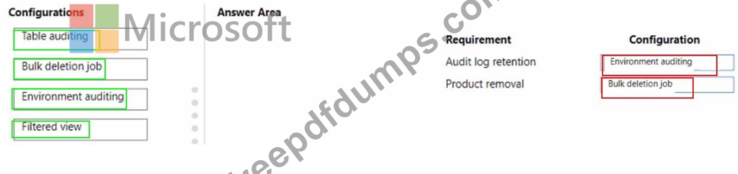 What should you configure? To answer, drag the appropriate configurations to the correct requirements. Each configuration may be used once, more than once, or not at all. You may need to drag the split bar between panes or scroll to view content.