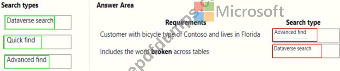 Which search should you configure? To answer, drag the appropriate search types to the correct requirements. Each search type may be used once, more than once, or not at all. You may need to drag the split bar between panes or scroll to view content.