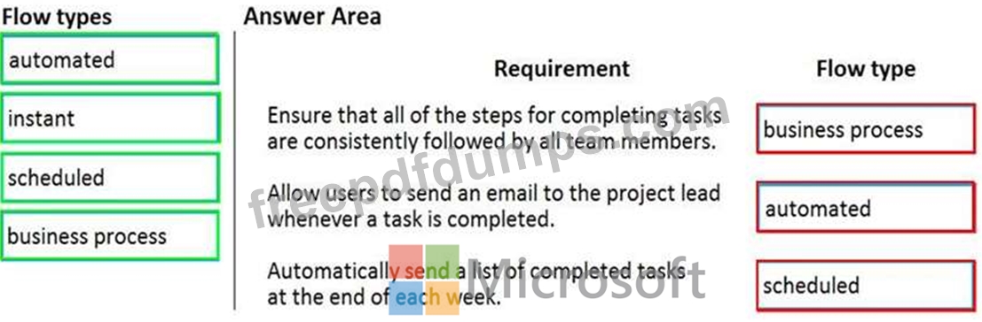 Which types of flows should you use? To answer, drag the appropriate flow types to the correct requirement. Each flow type may be used once, more than once, or not at all. You may need to drag the split bar between panes or scroll to view content.