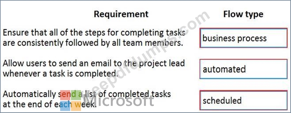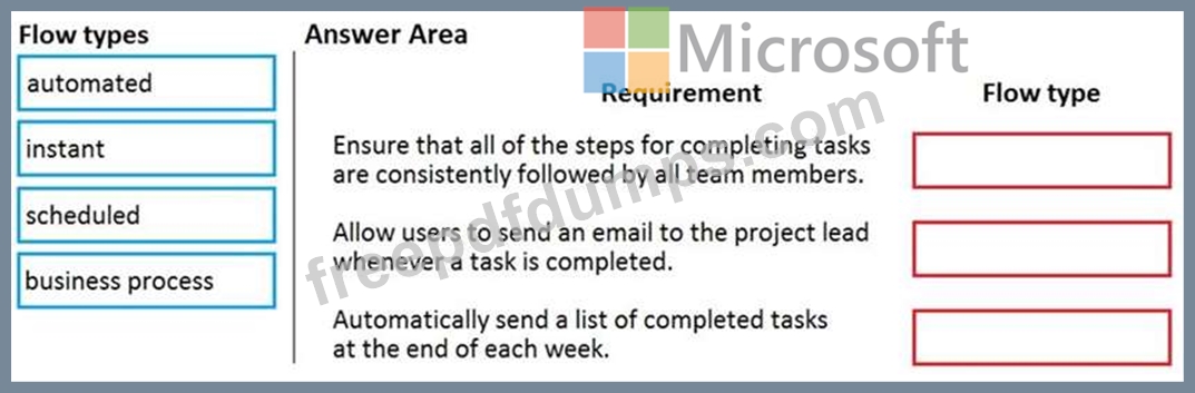 Which types of flows should you use? To answer, drag the appropriate flow types to the correct requirement. Each flow type may be used once, more than once, or not at all. You may need to drag the split bar between panes or scroll to view content.