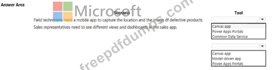 A company plans to use Power Platform to build apps that address specific business challenges. You need to recommend the appropriate types of Power Apps to use. What should you recommend? To answer, select the appropriate options in the answer area.