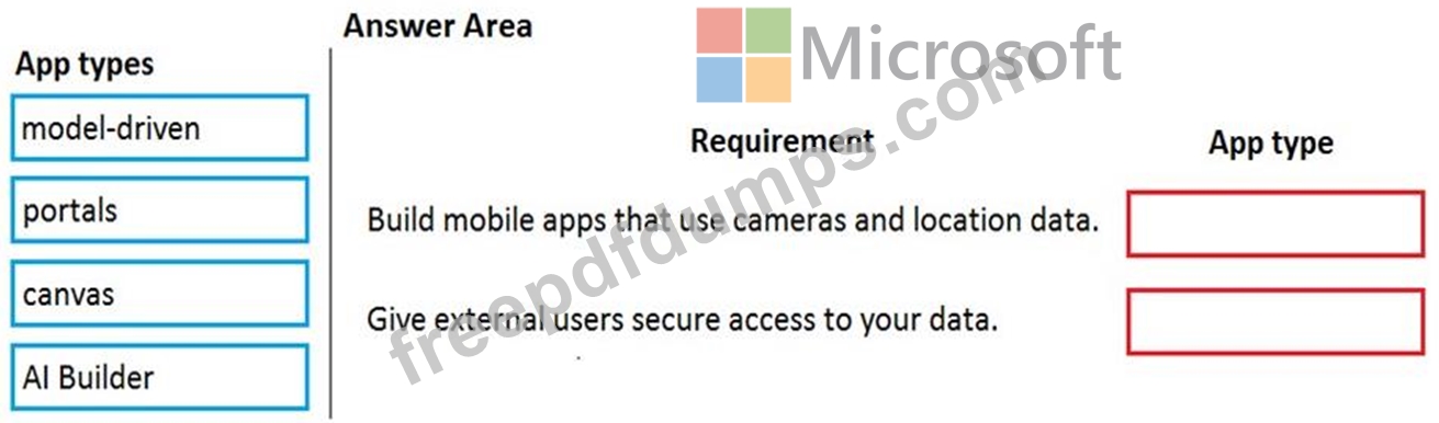 You need to recommend the appropriate types of Power Apps to meet the company's requirements.