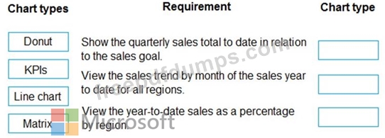Which chart types should you use? To answer, drag the appropriate chart types to the correct requirements. Each chart type may be used once, more than once, or not at all. You may need to drag the split bar between panes or scroll to view content.