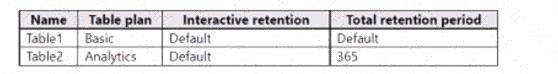 You have a Microsoft Sentinel workspace that has a default data retention period of 30 days. The workspace contains two custom tables as shown in the following table.