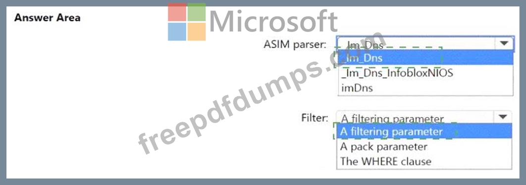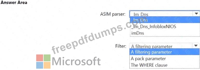You need to implement the ASIM query for DNS requests. The solution must meet the Microsoft Sentinel requirements. How should you configure the query? To answer, select the appropriate options in the answer area. NOTE: Each correct selection is worth one point.