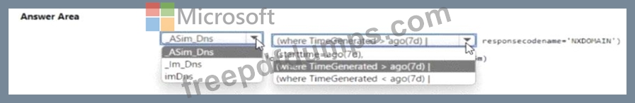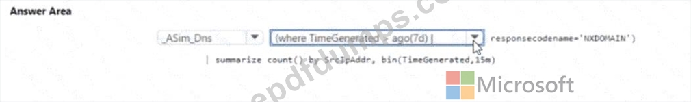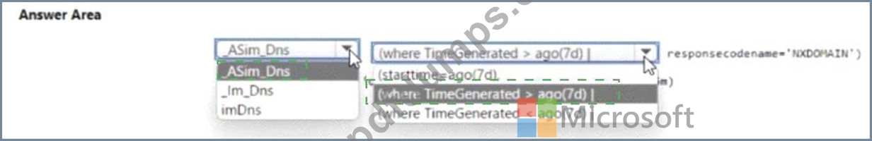 You need to create a query to investigate DNS-related activity. The solution must meet the Microsoft Sentinel requirements. How should you complete the Query? To answer, select the appropriate options in the answer area NOTE: Each correct selection is worth one point.