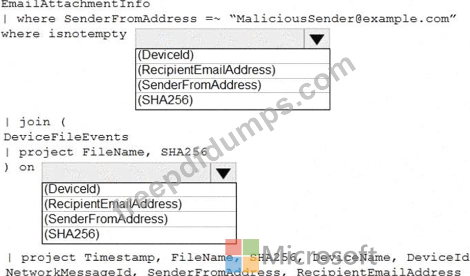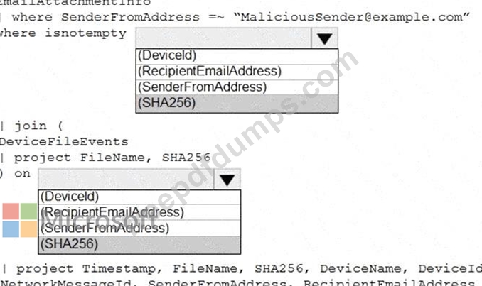 You need to identify all the devices that contain files in emails sent by a known malicious email sender. The query will be based on the match of the SHA256 hash.