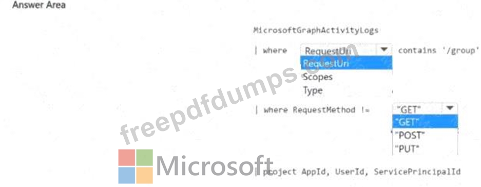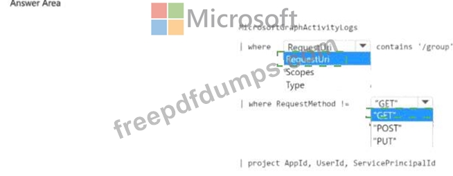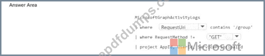 You need to identify all the security principals that submitted requests to change or delete groups. How should you complete the KQL query? To answer, select the appropriate options in the answer area.