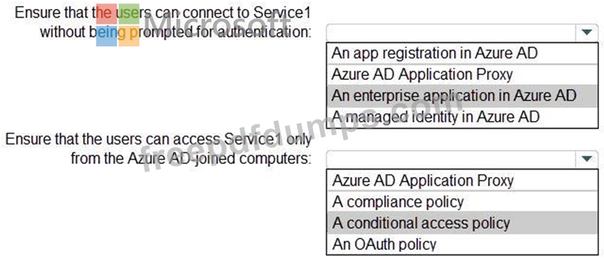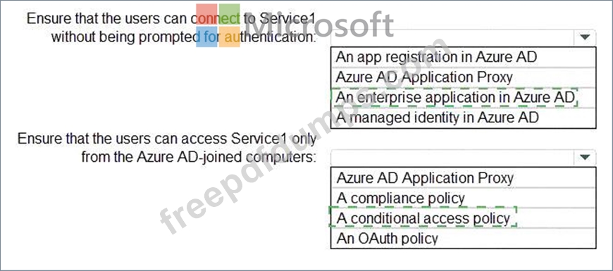 You need to recommend a solution to ensure that the users can connect to Service1 without being prompted for authentication. The solution must ensure that the users can access Service1 only from Azure AD-joined computers. The solution must minimize administrative effort.