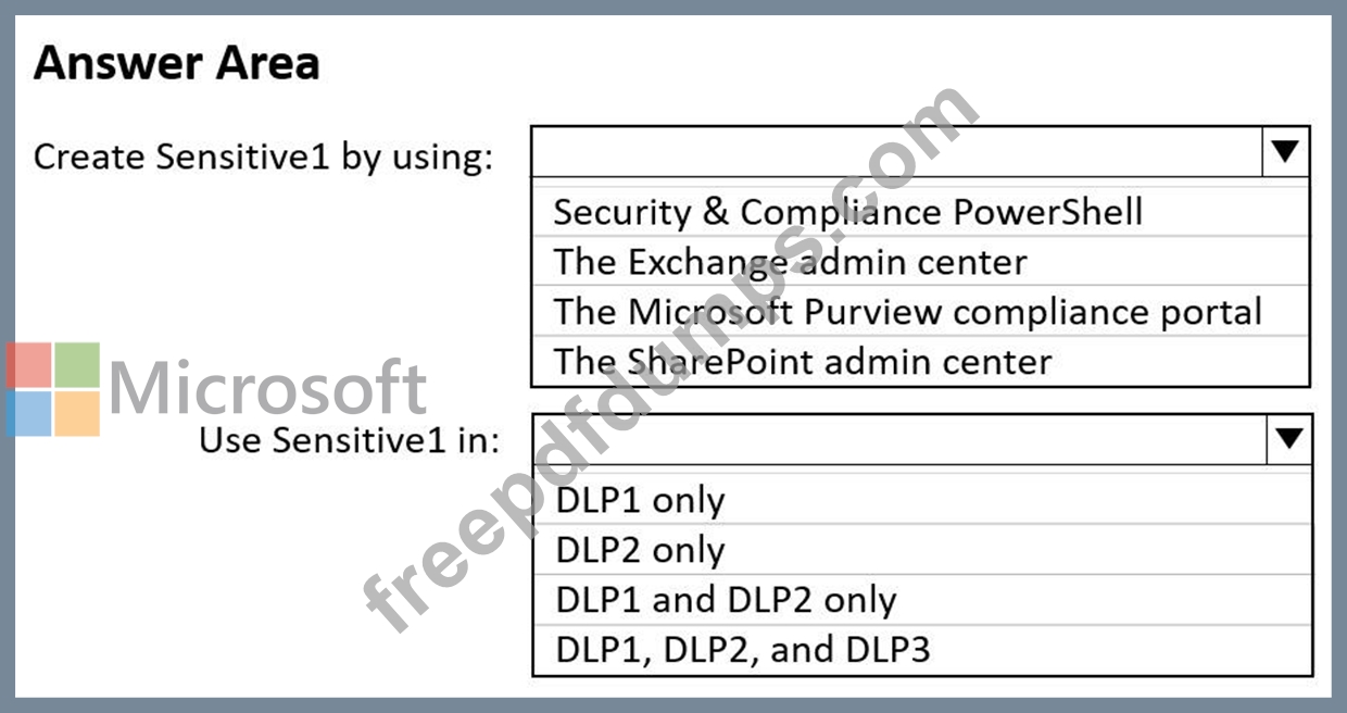 What should you use to create Sensitive1, and in which DLP policies can you use Sensitive1? To answer, select the appropriate options in the answer area.