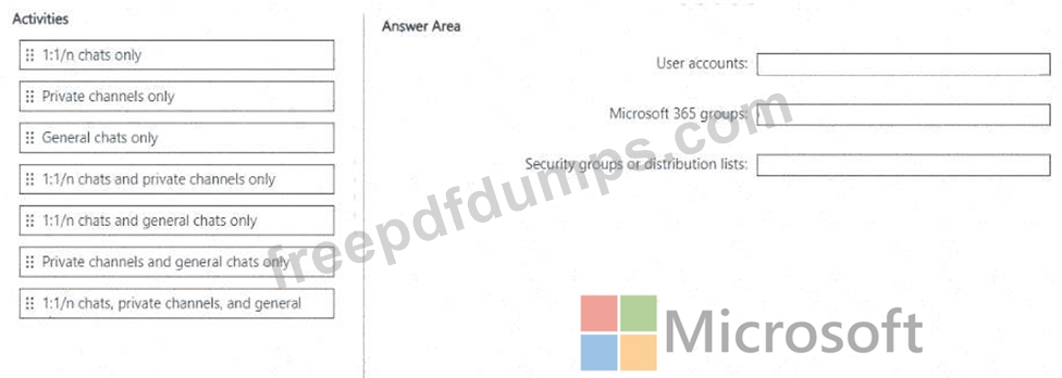 Which entities can you protect by applying a data loss prevention (DLP) policy to each resource? To answer, drag the appropriate activities to the correct entity. Each activity may be used once, more than once, or not at all. You may need to drag the split bar between panes or scroll to view content.