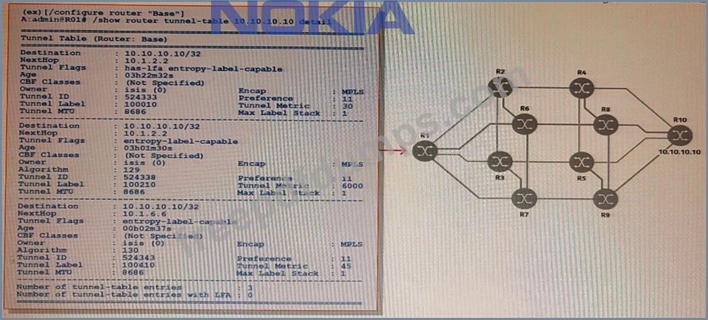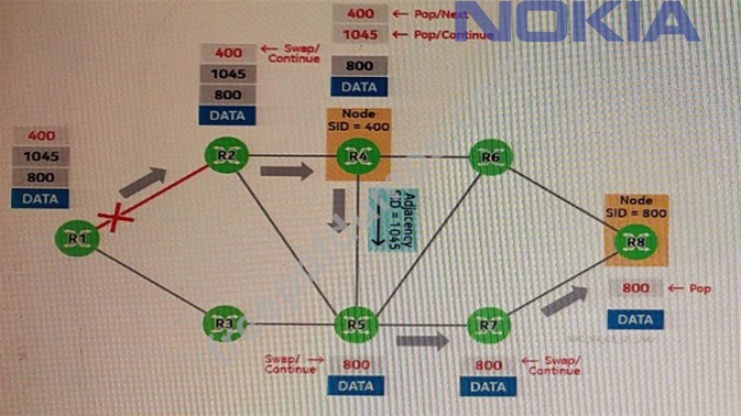 The exhibit presents packets being transmitted inside an LSP's multi-segment primary path going from router R1 to router R8. The LSP also has a standby secondary path, and Seamless-BFD has been enabled on the primary path. The link between routers R1 and R2 fails, and fast re-route (FRR) is triggered. As a result, router R1 forwards the packets to router R3 and adds the proper FRR encapsulation to reach which router?