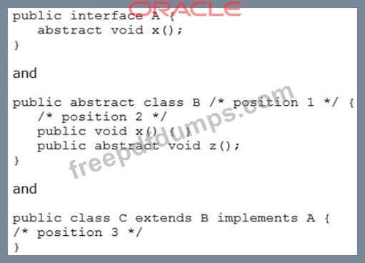 Which code, when inserted at one or more marked positions, would allow classes B and C to compile?
