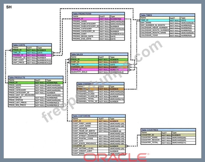 View the exhibit and examine the structure of the SALES, CUSTOMERS, PRODUCTS and TIMES tables.