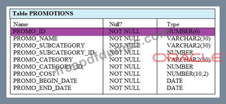 See the Exhibit and examine the structure of the PROMOTIONS table: