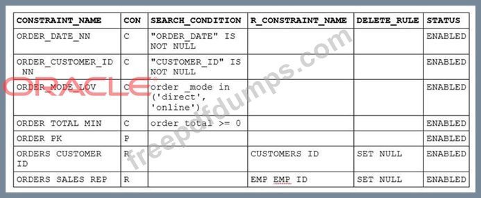Examine this SELECT statement and view the Exhibit to see its output: (Choose two.) SELECT constraints_name, constraints_type, search_condition, r_constraints_name, delete_rule, status, FROM user_constraints WHERE table_name = 'ORDERS'; Which two statements are true about the output?