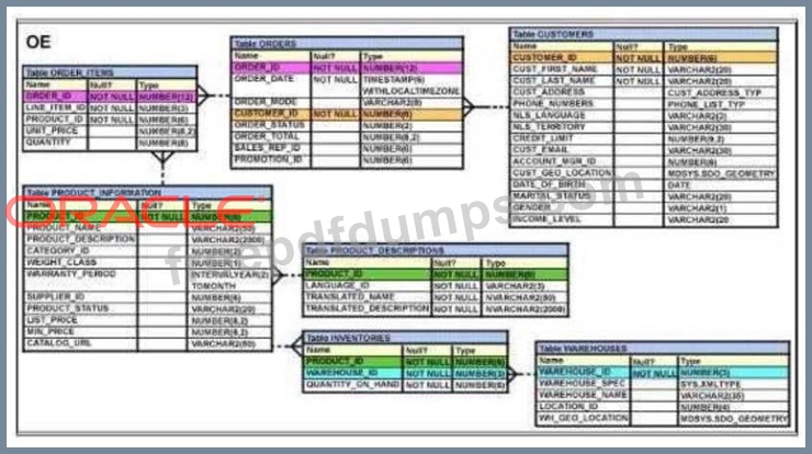 View the Exhibit and examine the structure of the PRODUCT_INFORMATION and INVENTORIES tables.