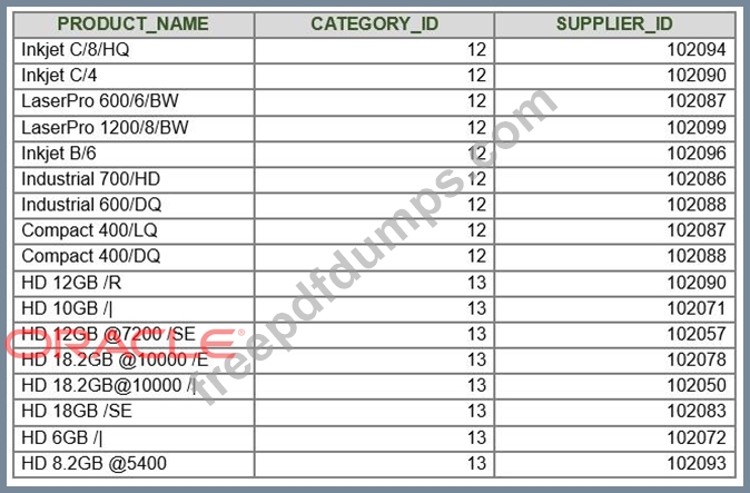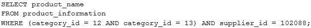 You must display PRODUCT_NAME from the table where the CATEGORY_ID column has values 12 or 13, and the SUPPLIER_ID column has the value 102088.